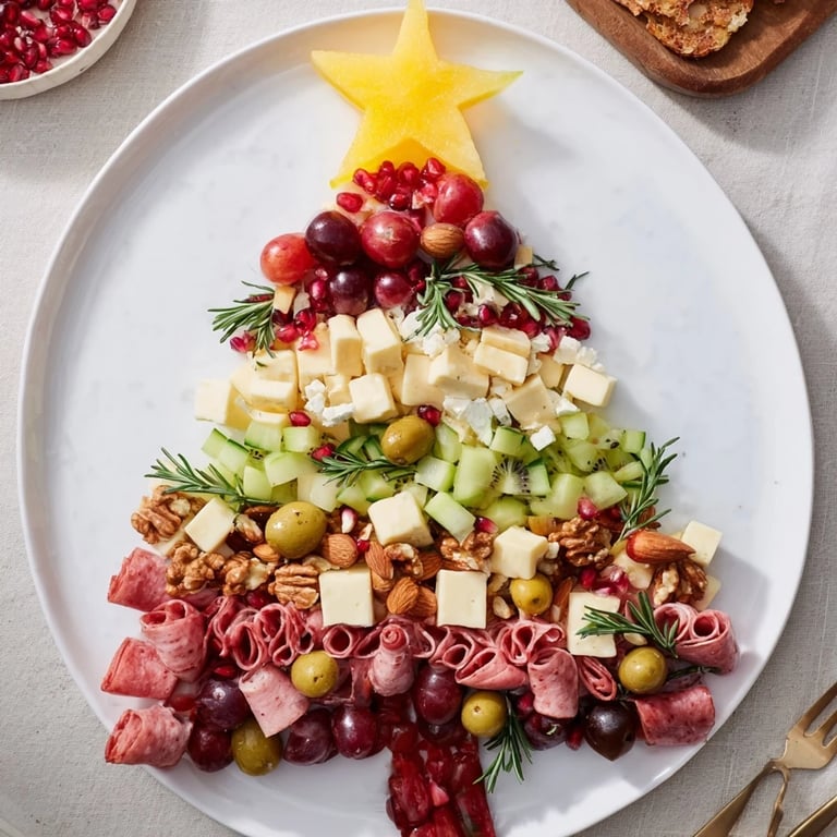 Start by arranging rosemary sprigs in a triangular shape on a serving board. Layer cheeses, fruits, nuts, and charcuterie in horizontal rows to fill the tree, topping it with a starfruit slice or shaped cheese.