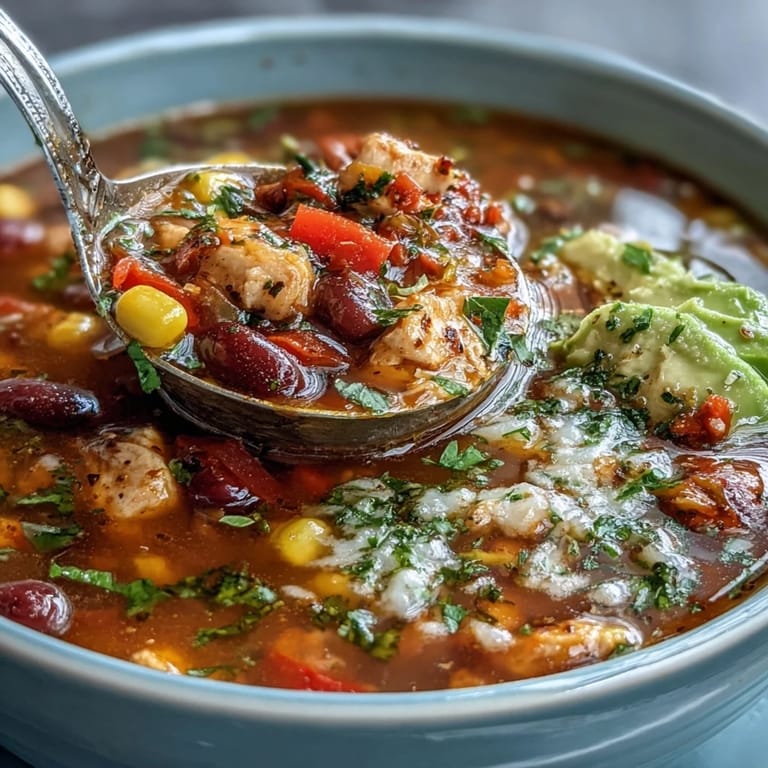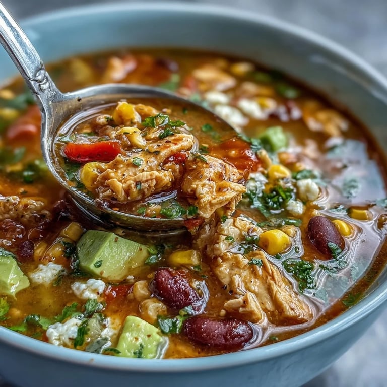 Save Last summer, my neighbor showed up at my door with an armful of farmers market peppers and a challenge: make something that tastes indulgent but keeps her gym routine on track. That afternoon, stirring a pot of golden broth studded with chicken and jewel-toned vegetables, I realized this soup was exactly what she needed. Bold taco flavors, real protein, none of the guilt. Now it's become my go-to when I want something that feels like comfort food but actually nourishes.