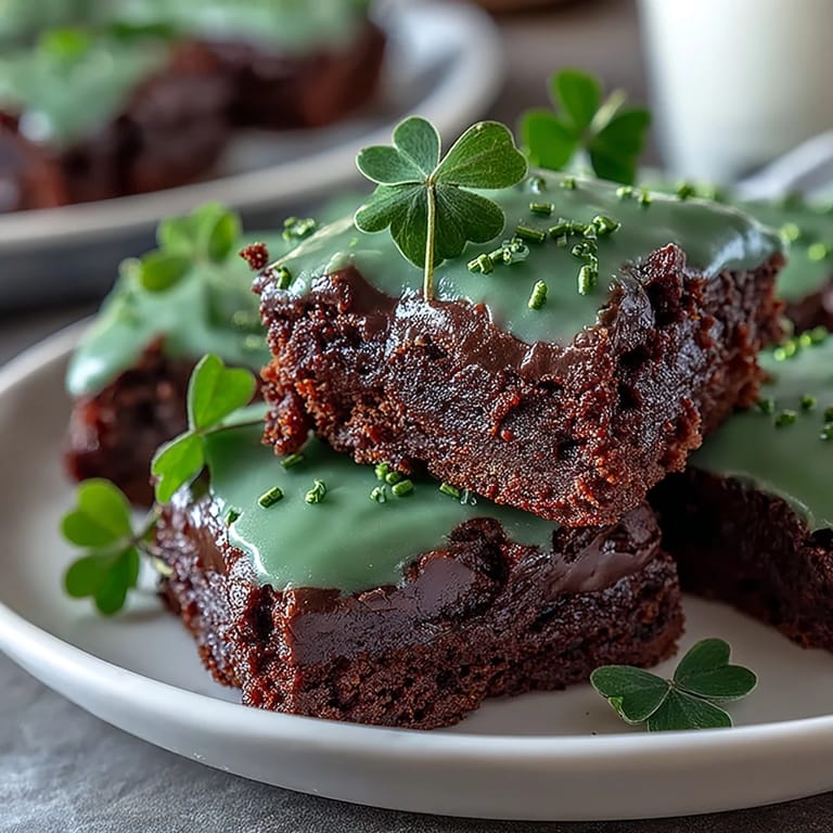 Serve these festive brownies on a white or gold platter to make the green icing pop. They pair beautifully with a tall glass of cold milk, a cup of Irish coffee, or even a scoop of vanilla ice cream. For parties, arrange them on a tiered stand alongside other St. Patrick's Day treats. These brownies also make wonderful gifts—pack them in clear cellophane bags tied with green ribbon for a thoughtful homemade present. Store brownies in an airtight container at room temperature for up to 3 days, though they rarely last that long!