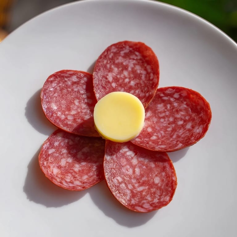 - On a clean serving plate, lay out your five salami slices in a rough circle, overlapping each one slightly so they fan outward like flower petals. You're not looking for perfection here—slight irregularity makes it feel intentional, like you actually made something.