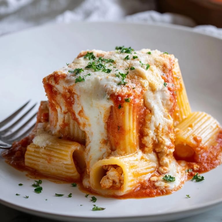 Save A stunning baked rigatoni dish where pasta stands upright, filled with rich tomato sauce, creamy ricotta, and gooey melted cheese—perfect for impressing guests and feeding a crowd.