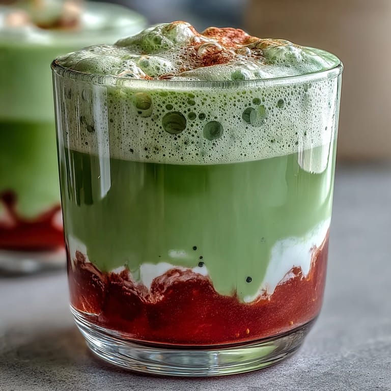 This vibrant drink combines sweet strawberry puree with earthy matcha and a smooth oat milk foam. The strawberry layer is gently cooked to bring out natural sweetness, matched with whisked matcha and lightly sweetened oat foam. Served chilled over ice, it's a refreshing and creamy fusion perfect for a quick, dairy-free refreshment. Simple preparation ensures quick enjoyment of this café-style beverage at home without dairy ingredients.